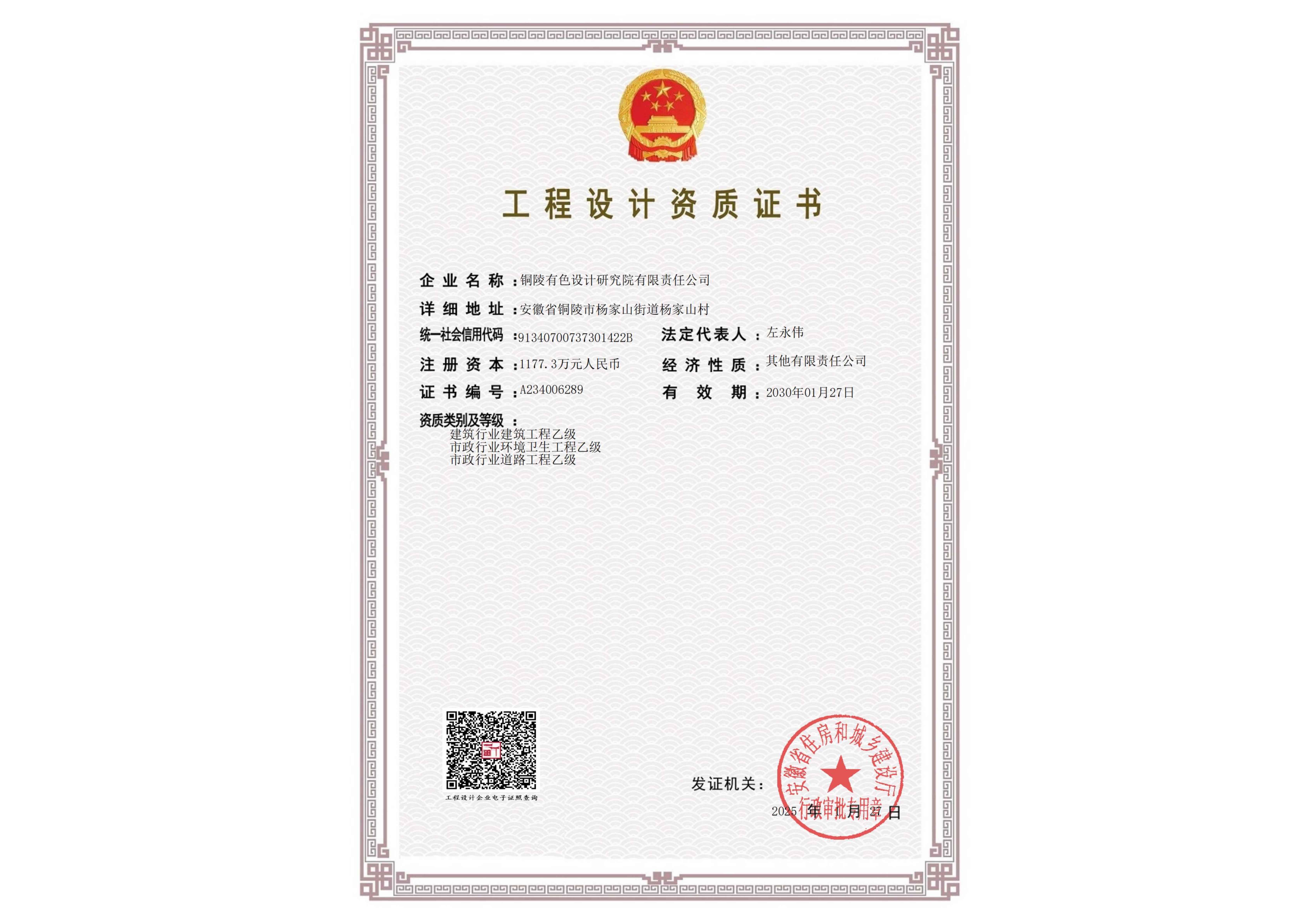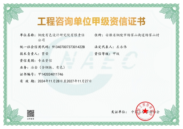 工程設(shè)計(jì)(冶金行業(yè)甲級(jí))資質(zhì)證書(shū)